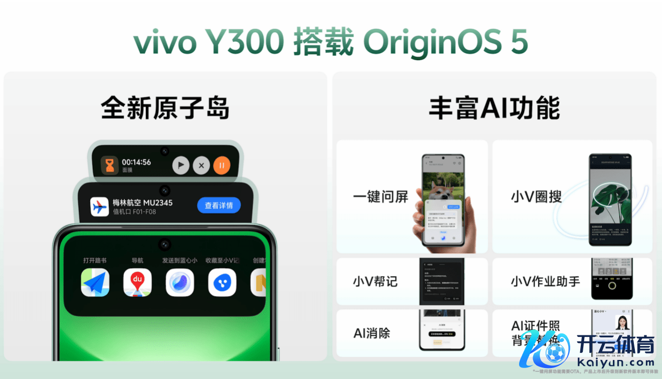 vivo Y300在Y系列居品中首发搭载OriginOS 5。由原子奉告进化的“原子岛”,以全新神气展本质时信息、系统情景等,还不错复制、拖拽本色,让劳动纯粹直达;卓绝的AI蓝心大模子再进化,小V圈搜、AI摈弃、小V帮记等智能助手奉陪。