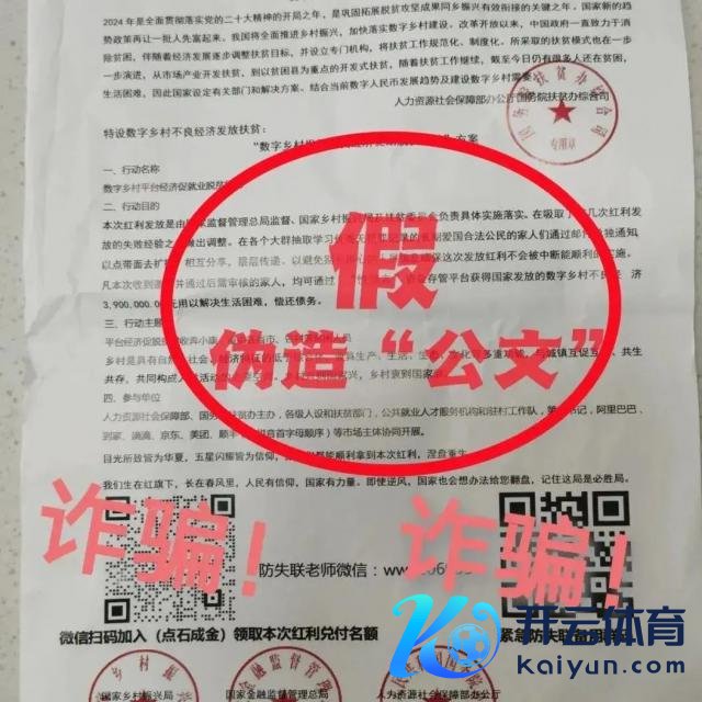 近日万博manbext网站登录 出现一种新式骗局 诳骗分子期骗造孽得回的公民个东谈主信息 将伪造的"国度公文" 邮寄给受害东谈主 请雄壮市民一又友们警惕 收到生分快递或收到此类"公文" � � 千万不要笃信� � 真的案例 一男人收到来历不解的快递 市民李先生(假名)向公安报警称,其收到一个生分快递,快递内有一册札记本和一份盖有国度乡村振兴局、国度金融监管总局、国务院钤记的"公文"。 李先生尝试扫码进群后,被客服报告有 390 万元的"扶贫基金"可领取。 随后,"职责主谈主员"开拓李先生下载一
