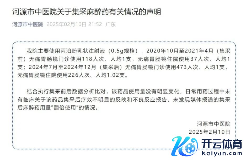 2月11日,广东省河源市医保局发布对于对《南风窗》关联报说念核实情况的通报称,2025年1月25日,《南风窗》在微博发布报说念称,大夫吐槽麻药无意麻不倒病东说念主,说起河源市某三甲病院麻醉科刘贺大夫反应病东说念主在作念无痛胃肠镜的查验时,无意需要加大丙泊酚的剂量现金万博manbext网站登录app平台,材干达到麻醉服从,而我方有些摸不准用量,有麻醉科大夫转头出集采丙泊酚的用药法则国产的按原研药旧例用量翻倍使用,遇上批次格外不好的,剂量翻两三倍。 通报暗示,集采药品事关东说念主民各人人命健康,河