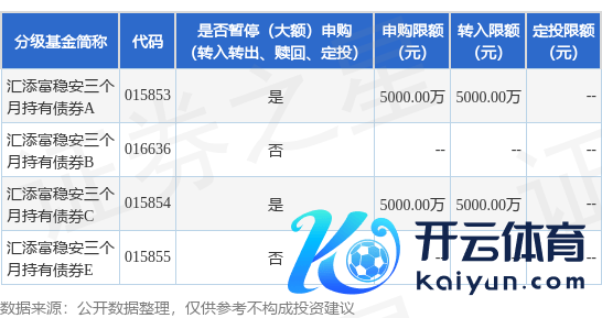 注:1、自2025年02月24日起(含2025年02月24日),汇添富稳安三个月合手有债券A暂停大额申购、大额调遣转入、大额依期定额投资业务,单日单个基金账户单笔或多笔累计申购、调遣转入、依期定额投资的金额不应高出50000000东说念主民币元(含50000000东说念主民币元)。当单日某基金账户单笔或多笔累计申购、调遣转入、依期定额投资该份额的金额高出50000000东说念主民币元,本公司将部分或沿路阻隔。该份额暂停上述大额业务本事,其他业务仍照常办理。自2025年02月28日起,本基金汇添富稳安三个月合手有债券A将收复办理大额申购、大额调遣转入、大额依期定额投资业务,届时将不再另行公告。2、自2025年02月24日起(含2025年02月24日),汇添富稳安三个月合手有债券C暂停大额申购、大额调遣转入、大额依期定额投资业务,单日单个基金账户单笔或多笔累计申购、调遣转入、依期定额投资的金额不应高出50000000东说念主民币元(含50000000东说念主民币元)。当单日某基金账户单笔或多笔累计申购、调遣转入、依期定额投资该份额的金额高出50000000东说念主民币元,本公司将部分或沿路阻隔。该份额暂停上述大额业务本事,其他业务仍照常办理。自2025年02月28日起,本基金汇添富稳安三个月合手有债券C将收复办理大额申购、大额调遣转入、大额依期定额投资业务,届时将不再另行公告。3、本公司已于2022年10月19日发布《对于汇添富稳安三个月合手有期债券型证券投资基金养息大额申购、调遣转入、依期定额投资业务的公告》,其中,对汇添富稳安三个月合手有债券E的大额申购、大额调遣转入、大额依期定额投资业务进行摈弃,汇添富稳安三个月合手有债券E摈弃金额自2022年10月19日起(含2022年10月19日)为1000元东说念主民币。4、本公司已于2023年08月04日发布《对于汇添富稳安三个月合手有期债券型证券投资基金B类份额养息大额申购、调遣转入、依期定额投资业务摈弃金额的公告》,对汇添富稳安三个月合手有债券B的大额申购、大额调遣转入、大额依期定额投资业务进行摈弃,汇添富稳安三个月合手有债券B摈弃金额自2023年08月04日起(含2023年08月04日)为100000元东说念主民币。